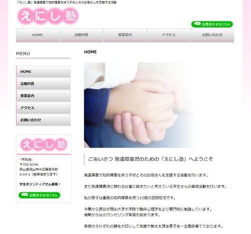 先日ご依頼頂いた「えにし塾」さんの ホームページが完成したので公開しました。 四つの縁(しえん)という活動理念で 岡山で発達障害で知的障害を伴う子供とそのお母さんを 支援する活動をされています。 えにし塾 初期費用¥0 小さなお店・事業のためのホー…